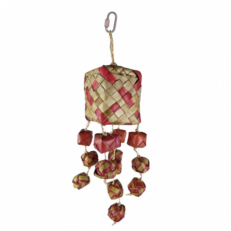 Material: Feito de materiais naturais, incluindo folhas de bananeira (abacá), palmeira, buri e milho. Estes materiais são biodegradáveis e ecológicos, tornando o brinquedo uma escolha sustentável tanto para as aves como para o ambiente.