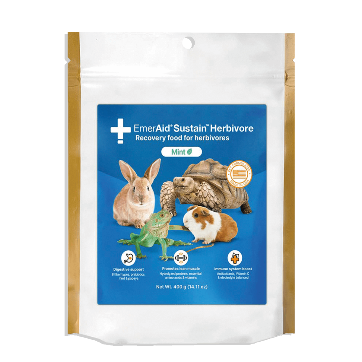 EmerAid Sustain Herbivore Support Porridge é uma dieta de recuperação rica em fibras, concebida para apoiar mamíferos herbívoros, incluindo coelhos, porquinhos-da-índia e chinchilas, que estão a recuperar de doenças críticas, sofrendo de condições médicas crónicas ou abaixo do peso. Foi também concebido para fazer a transição da nutrição de cuidados intensivos para a alimentação regular.