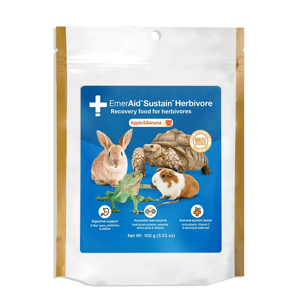 EmerAid Sustain Banana Apple Herbivore é um alimento altamente digestível, cientificamente desenvolvido para mamíferos herbívoros (coelhos, porquinhos-da-índia, chinchilas e outros) e répteis herbívoros (iguanas verdes, tartarugas e outros) em recuperação de doenças graves, com condições médicas crónicas ou com baixo peso. Contém sabores naturais de maçã e banana para melhorar a palatabilidade e estimular a alimentação independente. É também uma dieta de transição para herbívoros que estão a passar de cuidados intensivos para uma dieta regular. Contém nutrientes mais completos do que o EmerAid Intensive Care HDN. A fórmula em pó deve ser misturada com água para a alimentação. Um painel de especialistas, incluindo veterinários de animais exóticos, médicos de emergência e nutricionistas, desenvolveu esta fórmula para utilização em herbívoros em convalescença ou que sofrem de anorexia, doentes debilitados antes ou depois de cirurgias, anemia e muito mais.